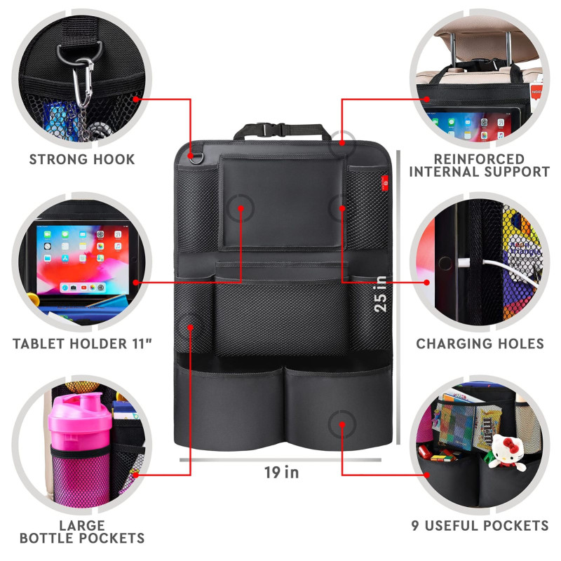Say goodbye to clutter! This multifunctional Car Backseat Organizer comes with 9 spacious pockets and a 10″ clear tablet holder, making it easy to store bottles, snacks, toys, power banks, phones, magazines, and more—keeping everything within easy reach.