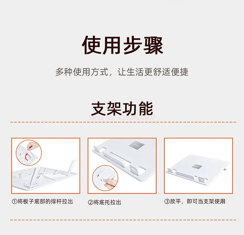 1.Three-piece Combination: Laptop Stand/Holder can be quickly assembled in a few seconds without any tools. The panel can also be used alone, and two-stage buckle on the panel is suitable for different types of computers.